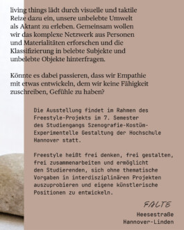 Die Ausstellung findet im Rahmen des Freestyle-Projekts im 7. Semester des Studiengangs Szenografie-Kostüm-Experimentelle Gestaltung der Hochschule Hannover statt. Freestyle heißt frei denken, frei gestalten, frei zusammenarbeiten und ermöglicht den Studierenden, sich ohne thematische Vorgaben in interdisziplinären Projekten auszuprobieren und eigene künstlerische Positionen zu entwickeln.