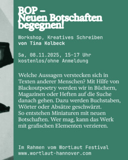 Welche Aussagen verstecken sich in Texten anderer Menschen? Mit Hilfe von Blackoutpoetry werden wir in Büchern, Magazinen oder Heften auf die Suche danach gehen. Dazu werden Buchstaben, Wörter oder Absätze geschwärzt. So entstehen Miniaturen mit neuen Botschaften. Wer mag, kann das Werk mit grafischen Elementen verzieren.